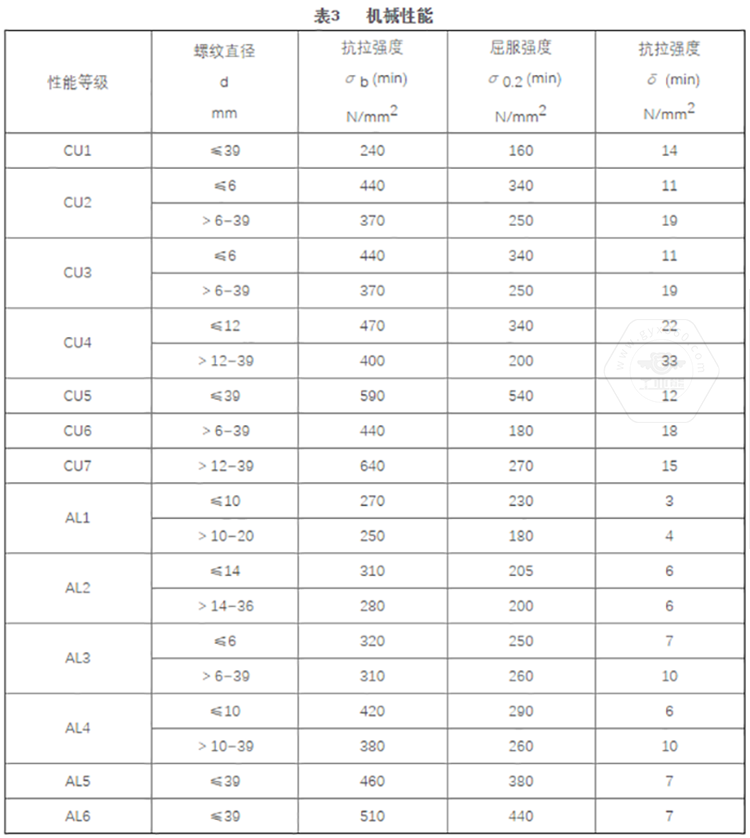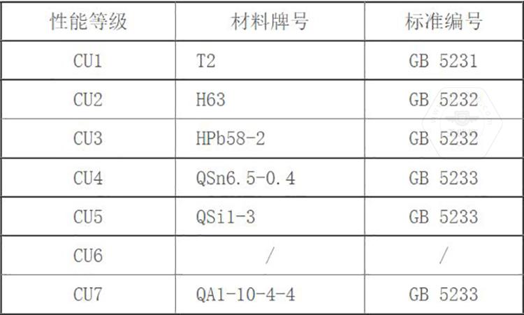 GB/T 3098.10標(biāo)準(zhǔn)中將銅制緊固件分為7個(gè)性能等級(jí),標(biāo)記代號(hào)由字母及數(shù)字兩部分組成,即有色金屬化學(xué)元素字母加數(shù)字。其性能等級(jí)為CU1、CU2、CU3、CU4、CU5、CU6、CU7。標(biāo)準(zhǔn)中同時(shí)推薦了對(duì)應(yīng)性能等級(jí)選用的銅材料牌號(hào)。
