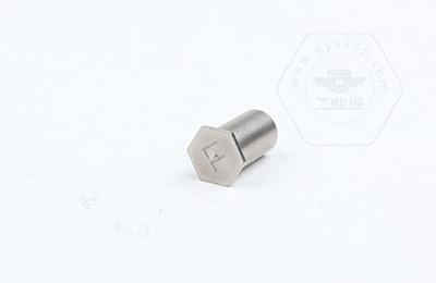 通過壓力機(jī)將六角頭壓入薄板的預(yù)置孔內(nèi)(預(yù)置孔的孔徑一般略大于壓鉚螺柱的圓柱外徑)使孔的周邊產(chǎn)生塑性變形,變形部分被擠入壓鉚螺母柱的退刀槽內(nèi),使壓鉚螺母柱鉚緊于薄板上,從而在薄板上形成一下有效固定的內(nèi)螺紋。